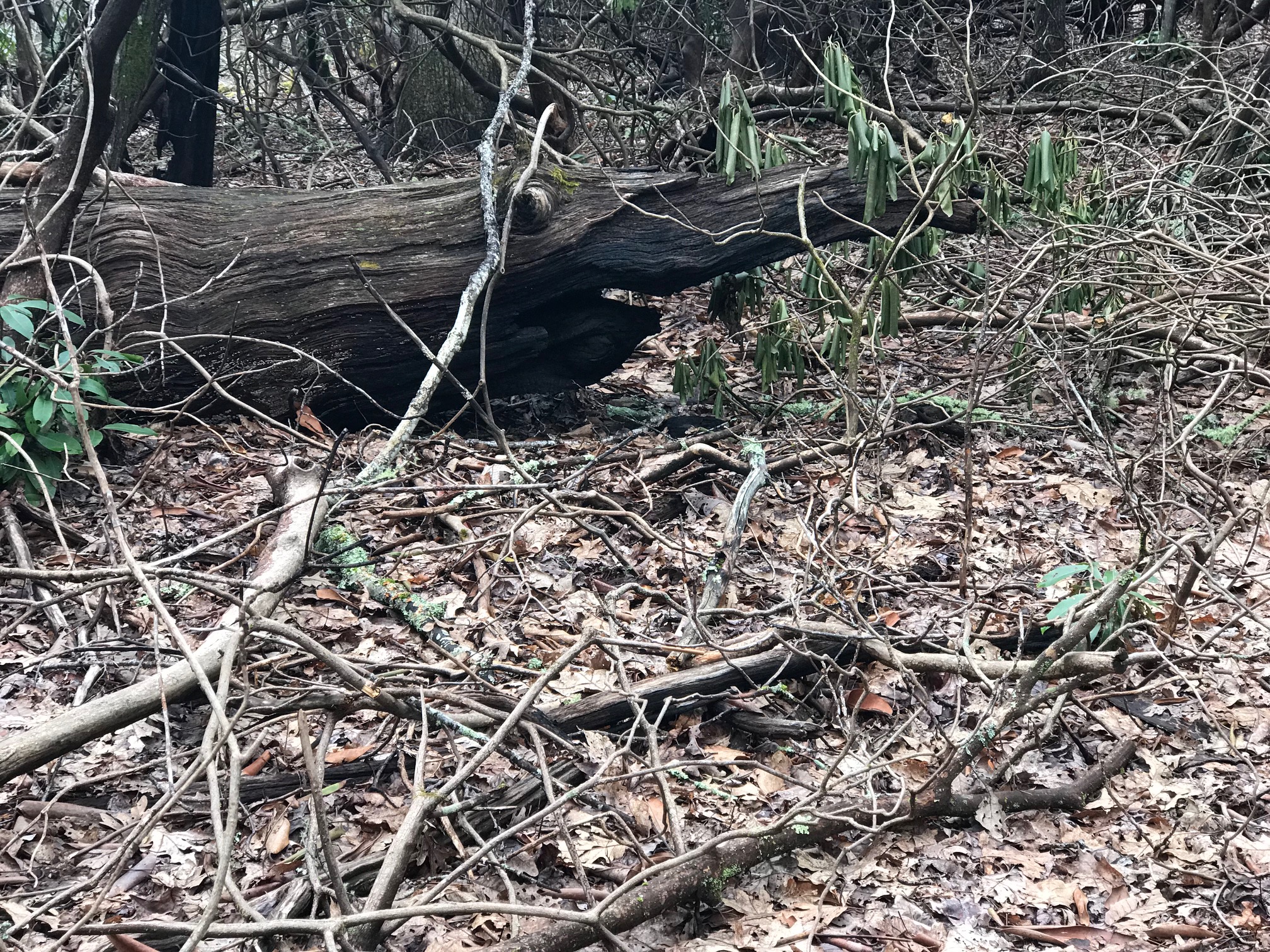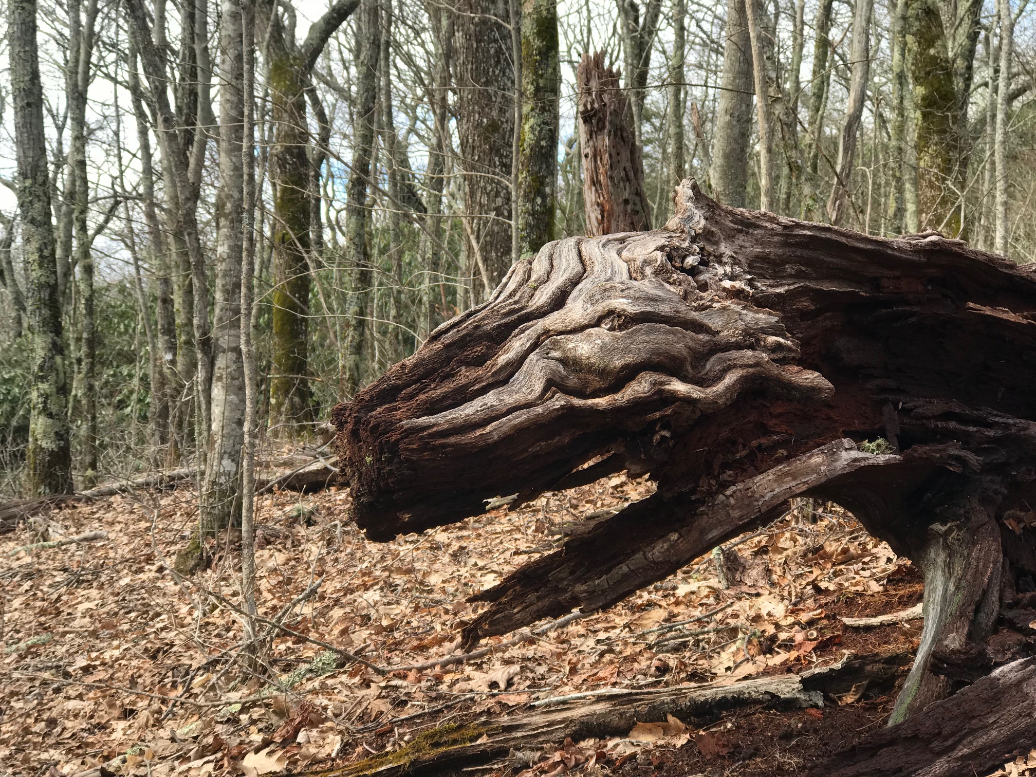 Long great day today.  I was in the zone, physically and mentally.  Climbed Standing Indian Mountain, the first one over 5000 feet, and Albert Mountain, also over 5000 feet and crazy steep.  Crossed the vaunted 100-mile mark!  You know what they say about completing the Appalachian Trail:  If a person makes it the first 100 miles, the odds go way up that they’ll . . . well . . . be pretty tired.  Saw weird stuff all day!  Look at this spooky section of Trail!